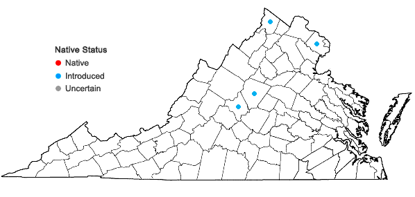 - Floodplain forests, mesic slope forests, old fields, and fencerows along the South Fork Rockfish River in west-central Nelson County; also recently documented in Albemarle (near Charlottesville), Frederick (near Winchester), Fairfax (Huntley Meadows Park), and Madison (near Aylor) counties. At the Nelson County site, this Asiatic species reportedly escaped from a nearby nursery tree farm in the 1970's, and is now common in different age classes over many acres; the full extent of this naturalized population has yet to be determined.