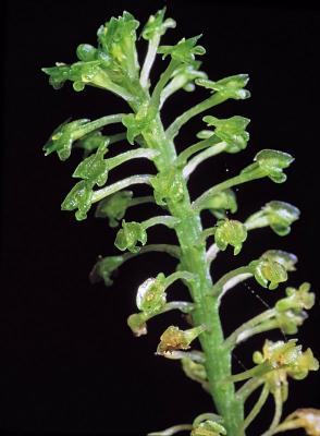 Malaxis bayardii has not always been a universally accepted taxon and was often treated as a synonym of the widespread and frequent M. unifolia until P.M. Catling's 1991 morphometric study comparing the two taxa. Catling found that the two species can be differentiated by lip basal lobe size and flower pedicel length, with M. bayardii having prominent lip basal lobes and pedicels 5mm or shorter (versus greater than 5mm in M. unifolia). Additionally, M. bayardii has persistent flowers that senesce and abscise much later than those of M. unifolia, a trait that when combined with the shorter pedicels imparts a more narrow and cylindric attitude to the raceme (versus wider and flat-topped in M. unifolia). Across its range M. bayardii has a generally bi-modal distribution, favoring dry woodlands in the mountains and sandy pine-oak woodlands in the coastal plain, and has even been recorded from shale barrens and road cuts in Pennsylvania. There is no shortage of seemingly appropriate habitat for the species, so its precipitous decline remains a mystery. - Habitat